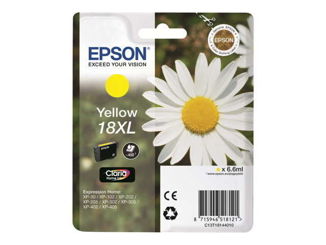 Produktbeskrivning Epson 18XL - XL - gul - original - bläckpatron Typ av produkt Bläckpatron Utskriftsteknik Bläckstråle Utskriftsfärg Gul Kassettens kapacitet XL Egenskaper för tonerkassett Epson Claria Home Ink Avkastning Upp till 450 sidor ISO/IEC 24711/24712 Kompatibel med Epson MUFC Printer; Expression Home XP-102, XP-202, XP-205, XP-212, XP-215, XP-225, XP-30, XP-302, XP-305, XP-312, XP-315, XP-322, XP-325, XP-402, XP-405, XP-405WH, XP-412, XP-415, XP-422, XP-425 - Nedladdningsbara filer