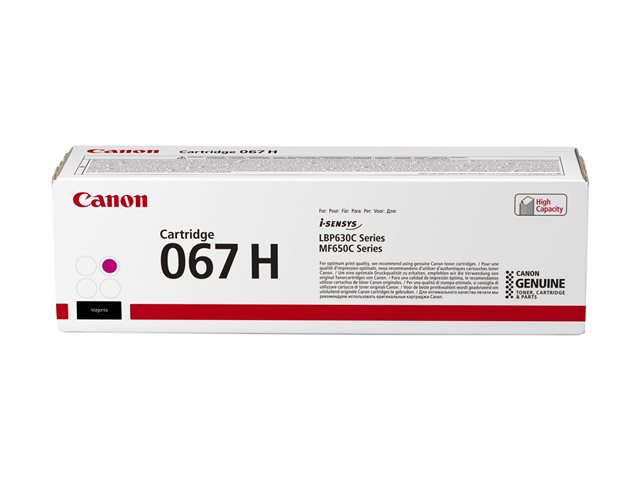 Produktbeskrivning Canon 067 H - hög kapacitet - magenta - original - tonerkassett Typ av produkt Tonerkassett Utskriftsteknik Laser Utskriftsfärg Magenta Kassettens kapacitet Hög kapacitet Avkastning Upp till 2350 sidor ISO/IEC 19798 Kompatibel med I-SENSYS LBP631CW, LBP633Cdw - Nedladdningsbara filer