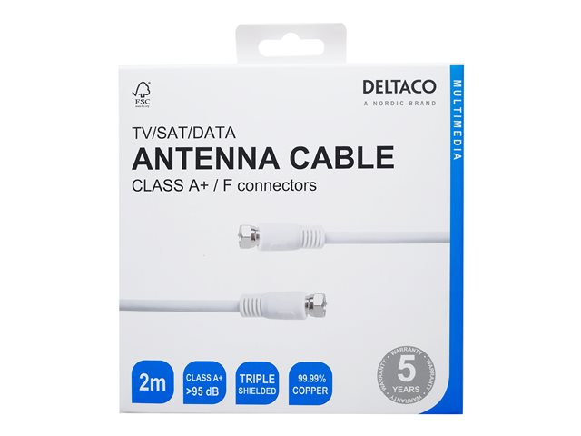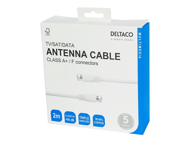 Produktbeskrivning DELTACO antennkabel - 2 m - vit Typ Antennkabel Teknik Tredubbelt skärmad koaxial Egenskaper Ledare i ren koppar Längd 2 m Kontaktdon F-kontakt - hane Kontakt (andra änden) F-kontakt - hane Färg Vit Förpackningstyp Detaljhandel - hängande låda Tillverkarens garanti 5 års garanti - Nedladdningsbara filer