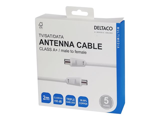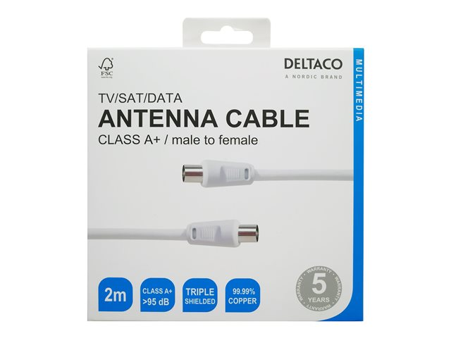Produktbeskrivning DELTACO antennkabel - 2 m Kabel Antennkabel Teknik Trippelskärmad Längd 2 m Färg Vit Kontaktdon IEC-kontakt - hane Kontakt (andra änden) IEC-kontakt - hona Egenskaper Ledare av ren koppar, skärmnivå A+, kabeldiameter 5,9 mm, 95 dB @ 30-1000 MHz Tillverkarens garanti 5 års garanti - Nedladdningsbara filer