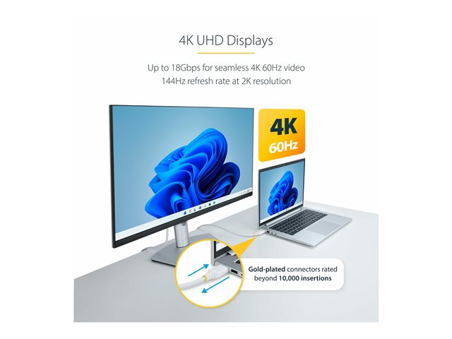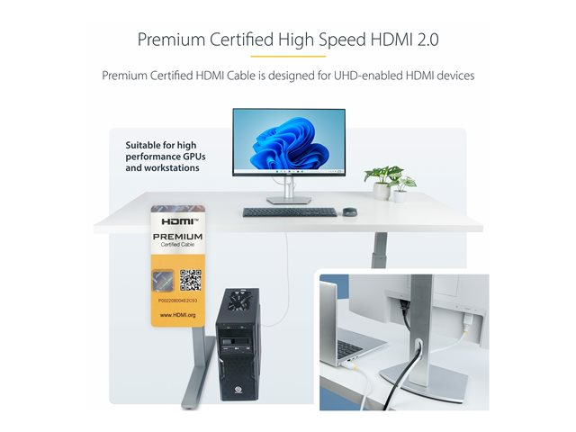 Produktbeskrivning StarTech.com 10ft (3m) Premium Certified High Speed HDMI Cable, 4K60Hz - HDMI-kabel med Ethernet - 3 m Kabel Premium hög hastighet - HDMI-kabel med Ethernet Teknik Skärmad American Wire Gauge (AWG) 30 Längd 3 m Färg Vit Kontaktdon HDMI - hane Kontakt (andra änden) HDMI - hane Egenskaper Passiv kabel, 2K144Hz stöd, 4K60Hz UHD-stöd, HDR10-stöd Tillverkarens garanti Begränsad livstidsgaranti - Nedladdningsbara filer
