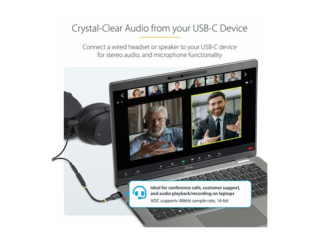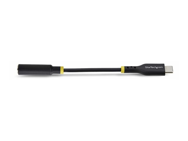 Produktbeskrivning StarTech.com USB-C Audio Adapter to 3.5mm TRRS Jack, Headphone Aux Dongle - USB-C till uttagsadapter för hörlurar - 12.7 cm Kabel USB-C till uttagsadapter för hörlurar Kabellängd 12.7 cm Färg Svart Kontaktdon USB-C - hane Kontakt (andra änden) 4-poligt minijack - hona Standarder som följs USB / USB 2.0 DAC Ja DAC-information 44.1 - 384 kHz - SNR: 105 dB Egenskaper 32-bitars DAC, Realtek ALC4030U chipset Tillverkarens garanti 2 års garanti - Tillbehör