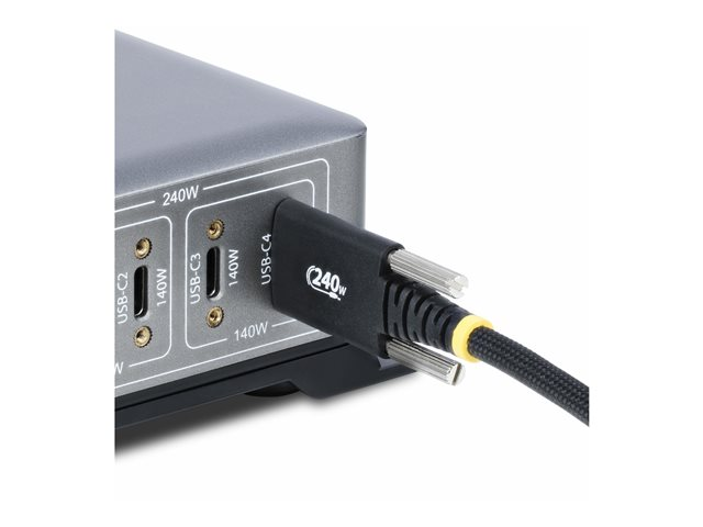 Produktbeskrivning StarTech.com 6.6ft (2m) USB-C Charging Cable, 240W, Silicone Jacket - USB typ C-kabel - USB-C till USB-C - 2 m Typ USB typ C-kabel Teknik Skärmad Egenskaper Utökat effektområde (EPR), USB-strömförsörjning (240W), Stöd för Power Delivery 3,1, synkronisering och laddning, EMI-skydd, halogenfri, e-markörchip, ABS-kopplingshus, 480 Mbit/s datahastighet, slitstark, robust, stöd för snabbladdning, klarar mer än 20.000 böjningar Kabellängd 2 m Kontaktdon 24 pin USB-C - hane - rakt/lockande Kontakt (andra änden) 24 pin USB-C - hane - rak Märkspänning 48 V Märkström 5 A Standarder som följs USB / USB 2.0 Färg Svart Tillverkarens garanti Begränsad livstidsgaranti - Nedladdningsbara filer