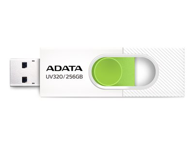 Produktbeskrivning ADATA UV320 - USB flash-enhet - 256 GB Produkttyp USB flash-enhet Gränssnittstyp USB 3.2 Gen 1 Minneskapacitet 256 GB Färg Vit/grön Operativsystem erfordras Linux 2.4, Apple MacOS X 10.6 eller senare, Microsoft Windows XP / Vista / 7 / 8 / 8.1 / 10, Windows 11 Tillverkarens garanti 5 års garanti - Nedladdningsbara filer