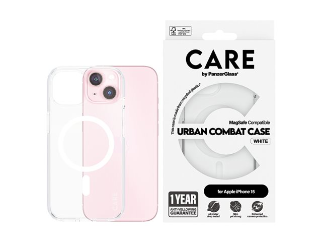 Produktbeskrivning CARE by PanzerGlass Urban Combat - baksidesskydd för mobiltelefon Typ av produkt Baksidesskydd för mobiltelefon - MagSafe-kompatibilitet Dimensioner (BxDxH) 7.7 cm x 1.3 cm x 15.2 cm Vikt 35 g Material Termoplastisk polyuretan (TPU), polykarbonat (PC), oleofobisk beläggning Färg Vit, transparent Återvunnet produktinnehåll 100 % - tillverkad av återvunnen plast Tillverkarens garanti 1 års garanti Designat för Apple iPhone 15 - Nedladdningsbara filer