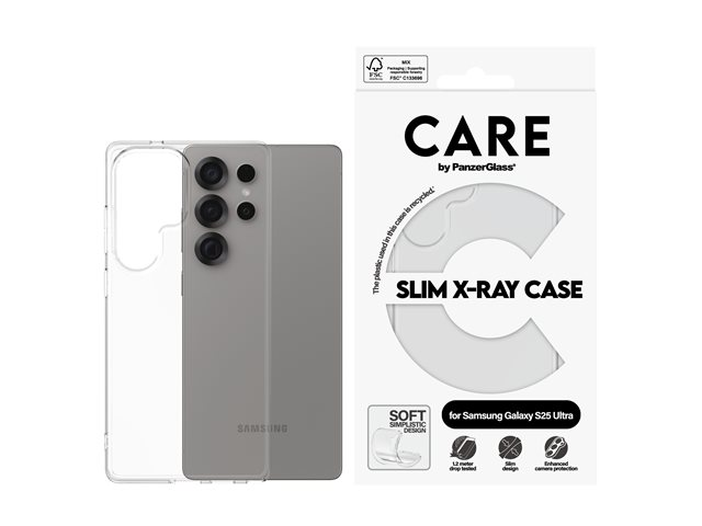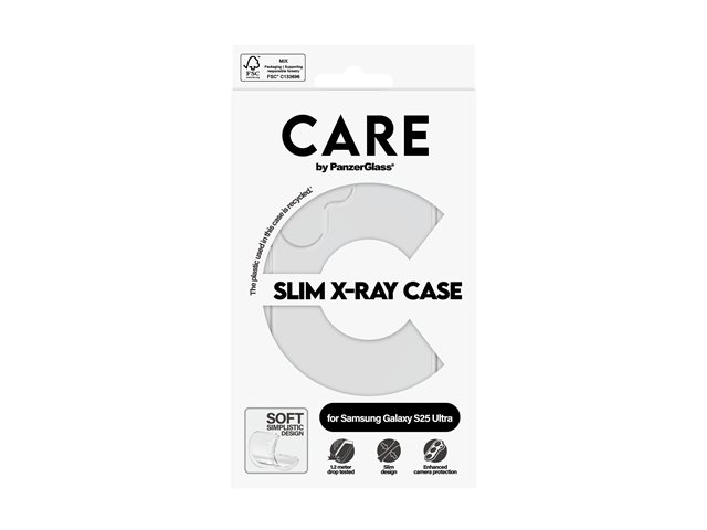 Produktbeskrivning CARE by PanzerGlass X-Ray - baksidesskydd för mobiltelefon Typ av produkt Baksidesskydd för mobiltelefon Dimensioner (BxDxH) 8.051 cm x 1.264 cm x 16.572 cm Vikt 26 g Material 100 % återvunnet termoplastpolyuretan (TPU) Färg Transparent Återvunnet produktinnehåll 100 % - tillverkad av återvunnen plast Designat för Samsung Galaxy S25 Ultra - Tillbehör