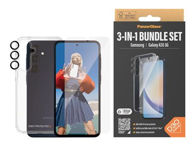 Produktbeskrivning PanzerGlass - 3-i-1-skyddspaket - baksidesskydd för mobiltelefon Typ av produkt Baksidesskydd för mobiltelefon Kombinerad med Skärm- och objektivskydd Material D3O Bio, 100 % återvunnen plast Designat för Samsung Galaxy A35 - Nedladdningsbara filer