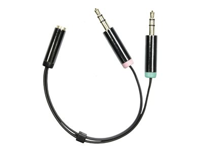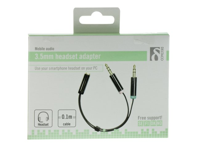 Produktbeskrivning DELTACO AUD-202 - headset-adapter - 10 cm Kabel Headset-adapter Längd 10 cm Färg Svart Kontakter 4-poligt minijack - hona Kontakter (andra änden) Mini-phone stereo 3.5 mm - hane