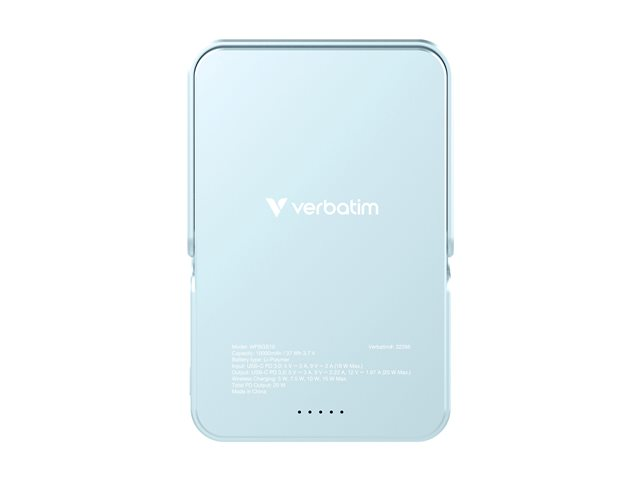 Produktbeskrivning Verbatim Charge 'n' Go trådlös powerbank - magnetisk, med stativ - Li-pol - 24 pin USB-C - 20 Watt Typ av produkt Trådlös powerbank Utformad för Mobiltelefon, surfplatta Dimensioner (BxDxH) 7.1 cm x 10.7 cm x 1.55 cm Vikt 217.8 g Färg Blå Typ av utkontakt 24 pin USB-C Tillförd spänning 12 V Max elektrisk ström 3 A Snabbladdningsteknik Power Delivery Trådlös laddning Ja Batteri Litiumpolymer - 10000 mAh Effekt 20 Watt Strömenhetsinformation - 24-stifts USB-C - inmatning - 9 V - 18 W - 2 A