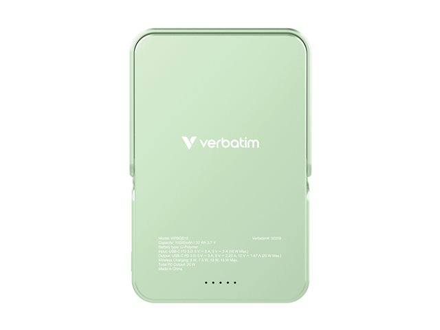 Produktbeskrivning Verbatim Charge 'n' Go trådlös powerbank - magnetisk, med stativ - Li-pol - 24 pin USB-C - 20 Watt Typ av produkt Trådlös powerbank Utformad för Mobiltelefon, surfplatta Dimensioner (BxDxH) 7.1 cm x 10.7 cm x 1.55 cm Vikt 217.8 g Färg Grön Typ av utkontakt 24 pin USB-C Tillförd spänning 12 V Max elektrisk ström 3 A Snabbladdningsteknik Power Delivery Trådlös laddning Ja Batteri Litiumpolymer - 10000 mAh Effekt 20 Watt Strömenhetsinformation - 24-stifts USB-C - inmatning - 9 V - 18 W - 2 A