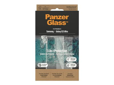 Produktbeskrivning PanzerGlass - 3-i-1-skyddspaket - skyddskit skärm/objektiv/baksida för mobiltelefon Typ av produkt Skyddskit skärm/objektiv/baksida Avsedd för Mobiltelefon Skydd Reptålig, droppskydd, antibakteriell, stötskydd, motstår fingeravtryck Beläggning Fläcktåligt Förpacknings innehåll Skärmskydd, skyddsfodral, linsskydd, EasyAligner Designat för Samsung Galaxy S23 Ultra - Nedladdningsbara filer