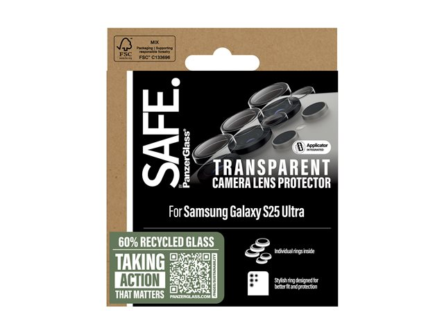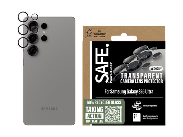 Produktbeskrivning SAFE. by PanzerGlass - linsskydd för mobiltelefon Typ av produkt Linsskydd Avsedd för Mobiltelefon Skydd Reptålig, vattenavstötande, droppskydd, stötsäkert, motstår fingeravtryck, oljeavvisande Beläggning Oleofob Förpacknings innehåll Applikator, 5 lens protectors Produktmaterial Härdat glas, 100 % återvunnet polykarbonat Dimensioner (BxDxH) 6.5 cm Längd 7.5 cm Grovlek 0.33 mm Vikt 8 g Färg Transparent Designat för Samsung Galaxy S - Tillbehör