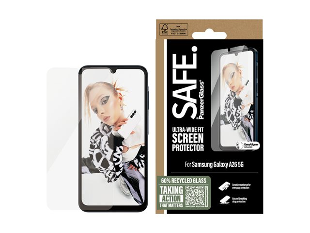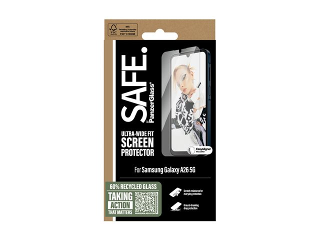 Produktbeskrivning SAFE. by PanzerGlass - skärmskydd för mobiltelefon - ultrabred passning med EasyAligner Typ av produkt Skärmskydd - glas Avsedd för Mobiltelefon Skydd Reptålig, vattenavstötande, smutsavstötande, droppskydd, stötsäkert, klåfingerskydd, motstår fingeravtryck, oljeavvisande, fettskydd, fläcktålig Beläggning Oleofob Produktmaterial Härdat glas, PET (Polyethylene Terephthalate) Dimensioner (BxDxH) 7.363 cm Längd 16.011 cm Grovlek 0.51 mm Vikt 23 g Designat för Samsung Galaxy A26 - Nedladdningsbara filer