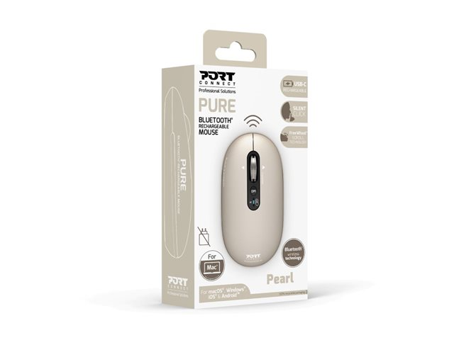 Produktbeskrivning PORT Connect PURE COLOR - mus - laddningsbar - Bluetooth - pärla Typ av enhet Mus Anslutningsteknik Trådlös - Bluetooth Färg Pärla Inriktning Höger- och vänsterhänta Dimensioner (BxDxH) 6.5 cm x 11 cm x 2.5 cm Vikt 85 g Teknik för rörelsedetektering Optisk Antal knappar 5 Rörelseupplösning 3200 dpi Prestanda Sensivitetsomkoppling i realtid 1000/1600/2400/3200 dpi Egenskaper Tyst klick, scrollhjul, FreeWheel-teknik, vänster och höger knappar Operativsystem erfordras Apple MacOS, Microsoft Windows, Apple iOS, Android Tillverkarens garanti 3 års garanti - Nedladdningsbara filer