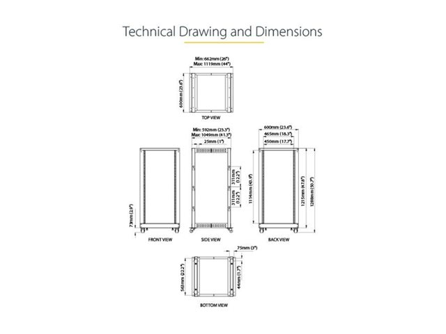Produktbeskrivning StarTech.com 25U-serverrack med öppen ram - 4 stolpar justerbart djup (59 cm till 104 cm) rack för nätverksutrustning med hjul/nivåfötter/kabelhantering (4POSTRACK25U) - rack - 25U Produkttyp Rack Racktyp Öppen ram Förpackningens innehåll Stjärnmejsel, 16 x M6-skruvar, 2 baskonsoler, 2 toppkonsoler, 48 x M8-bultar, 8 x hörnsektioner, 48 x M8-brickor, M8-nyckel (13 mm), 4 x hjul, 4 x utjämningsfötter, 16 x M6 flänsmuttrar, 32 x PVC-brickor, 32 x M6-hylsmuttrar, M6-nyckel (10 mm), 4 x mittsektioner, 2 x högervertikala skenor, 2 x vänstervertikala skenor, 4 x jordledningar, 16 x M6 platta brickor, 12 x hakmonteringsskruvar, 12 kabelhanteringskrokar, 32 x M6-krysskruvar Färg Svart Höjd (U-format) 25U Produktmaterial Stål Dimensioner (BxDxH) 60 cm x 66.18 cm x 121.9 cm Vikt 20 kg Egenskaper Inställningsbart djup, platt paket, 4 postrackmonteringsbara, 4 stänger Tillverkarens garanti 2 års garanti Designat för P/N: CABCAGENT62B, CABCAGENTS62, CABCAGENUT2B, CABCAGENUT6B, CABCAGENUTS2, CABCAGENUTSB, CABSCREWM52B, CABSCREWM5B, CABSCREWM62B, CABSCREWM6B, CABSCREWSB, CABSCREWSM5, CABSCREWSM5B, CABSCREWSM62, CABSCREWSM6B, CABSCRWS1224, CABSCRWSM62B - Tillbehör