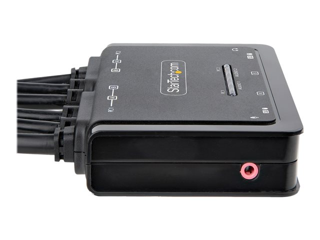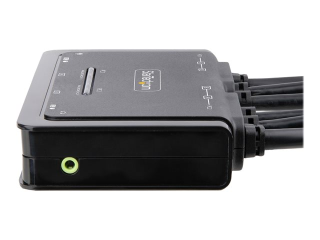 Produktbeskrivning StarTech.com 2-Port Dual-Monitor DisplayPort Cable KVM Switch, 4K 60Hz, Compact KVM with 5ft/1.5m USB-A/DisplayPort/Audio Integrated Cables, Bus Powered - Remote Push Button/Hotkey Switching (C2-DD46-UA2-CBL-KVM) - omkopplare för tangentbord/video/mus/ljud/USB - kompakt - 2 portar Typ av enhet Omkopplare för tangentbord/video/mus/ljud/USB - 2 portar Undertyp KVM Portar 2 x KVM/ljud/USB Antal KVM-användare 1 lokal användare Funktioner Fjärromkopplare, stöd för 2,1 ljudkanal, ABS-hus, bussdriven Standarder som följs USB 2.0 Dimensioner (BxDxH) 9 cm x 12.5 cm x 2.5 cm Vikt 600 g Färg Svart Systemkrav Linux, Google Chrome OS, Apple macOS 10.12 - 10.15, Apple macOS 11.0, Microsoft Windows 7 / 8 / 8.1 / 10 / 11, Apple macOS 12.0 Tillverkarens garanti 2 års garanti - Tillbehör