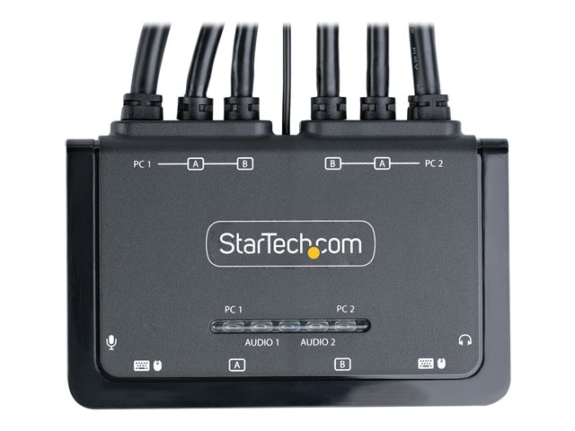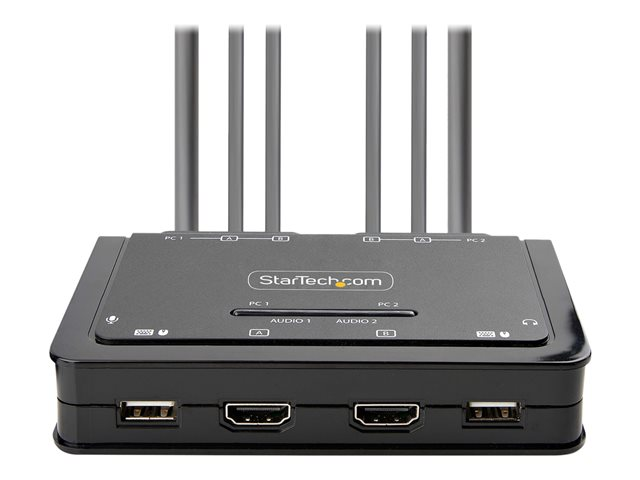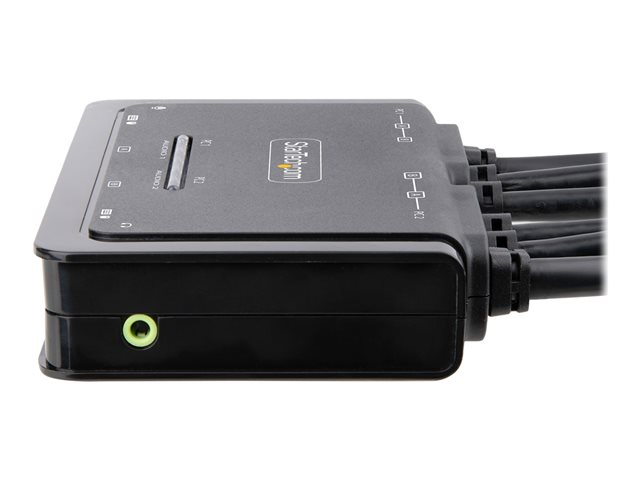Produktbeskrivning StarTech.com 2-Port Dual-Monitor HDMI Cable KVM Switch, 4K 60Hz, Compact KVM with 5ft/1.5m USB-A/HDMI/Audio Integrated Cables, Bus Powered - Remote Push Button/Hotkey Switching (C2-DH46-UA2-CBL-KVM) - omkopplare för tangentbord/video/mus/ljud/USB - kompakt - 2 portar Typ av enhet Omkopplare för tangentbord/video/mus/ljud/USB - 2 portar Undertyp KVM Portar 2 x KVM/ljud/USB Antal KVM-användare 1 lokal användare Funktioner Drivs via USB, fjärromkopplare, stöd för 2,1 ljudkanal, ABS-hus Standarder som följs USB 2.0 Dimensioner (BxDxH) 12.7 cm x 8.3 cm x 2.6 cm Vikt 600 g Färg Svart Systemkrav Linux, Google Chrome OS, Apple macOS 10.12 - 10.15, Apple macOS 11.0, Microsoft Windows 7 / 8 / 8.1 / 10 / 11, Apple macOS 12.0 Tillverkarens garanti 2 års garanti - Tillbehör