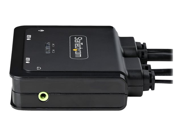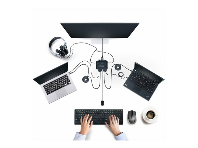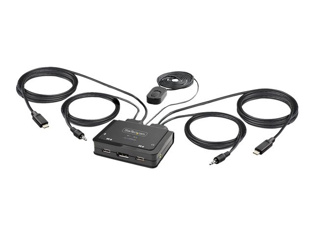 Produktbeskrivning StarTech.com 2-Port USB-C Cable KVM Switch, 4K 60Hz DisplayPort Output, Compact KVM with 4ft/1.2m USB Type-C/Audio Integrated Cables, Bus Powered - Remote Push-Button/Hotkey Switching (C2-D46-UC2-CBL-KVM) - omkopplare för tangentbord/video/mus/ljud - kompakt - 2 portar Typ av enhet Omkopplare för tangentbord/video/mus/ljud - 2 portar Undertyp KVM Portar 2 x KVM/ljud Antal KVM-användare 1 lokal användare Funktioner Drivs via USB, fjärromkopplare, DisplayPort alternativt läge Dimensioner (BxDxH) 9.7 cm x 8.3 cm x 2.5 cm Vikt 350 g Färg Svart Systemkrav Google Chrome OS, Apple macOS 10.12 - 10.15, Apple macOS 11.0, Microsoft Windows 7 / 8 / 8.1 / 10 / 11, Apple macOS 12.0 Tillverkarens garanti 2 års garanti - Tillbehör