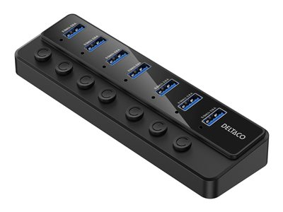 Produktbeskrivning DELTACO UH-739 - hubb - with switches, power supply included - 7 portar Typ av enhet Hubb - 7 portar Undertyp USB Portar 7 x SuperSpeed USB 3.0 Prestanda Dataöverföringshastighet: 5 Gbit/s Funktioner LED-statusindikatorer, 7 individual power buttons Standarder som följs USB 3.0 Dimensioner (BxDxH) 15.2 cm x 4.6 cm x 1.9 cm Vikt 220 g Färg Svart Systemkrav Microsoft Windows 7 / 8 / 10 / 11, Apple MacOS, Apple iOS, Android Tillverkarens garanti 5 års garanti - Nedladdningsbara filer