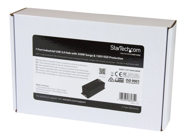 Produktbeskrivning StarTech.com USB 3.0-hubb med 7 portar - Industriell USB-A-hubb i metall med ESD-skydd och 350 W överspänningsskydd - Monterbar på DIN-skena, vägg eller skrivbord - TAA-kompatibel USB-expansionshubb - hubb - 7 portar Typ av enhet Hubb - 7 portar Undertyp USB Portar 7 x SuperSpeed USB 3.0 Funktioner Överspänningsskydd, robust, 15KV ESD Protector, metallhölje Standarder som följs USB 1.1, USB 2.0, USB 3.0 Strömtillförsel Likström 7 - 48 V Dimensioner (BxDxH) 5.5 cm x 12.2 cm x 4.3 cm Vikt 650 g Färg Svart Tillverkarens garanti 2 års garanti Designat för P/N: ITB20D3250, USB312SAT3CB, USB315CB2M, USBLT1MW, USBLT1MWS, USBLT2MBR, USBLT2MW, USBLT30CMW, USBLTM1MBK, USBLTM1MWH, UUSBHAUB1RA, UUSBHAUB3, UUSBHAUB3LA, UUSBHAUB3RA, UUSBHAUB6IN, UUSBHAUB6RA - Tillbehör