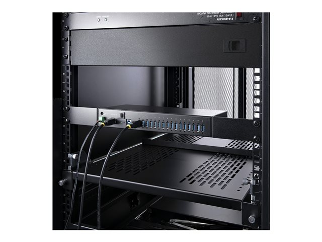 Produktbeskrivning StarTech.com 16-Port Industrial USB 5Gbps Hub with Power Adapter, Metal Enclosure, Mountable, ESD Protection, Terminal Block Power, USB Charging, Dual-Host Switch - TAA - hubb - 16 portar - rackmonterbar - TAA-kompatibel Typ av enhet Hubb - 16 portar Modell Rackmonterbar 1U Undertyp USB Portar 16 x USB 3.2 Gen 1 Prestanda Dataöverföringshastighet: 5 Gbit/s Funktioner Skruvlås, överspänningsskydd, metallhölje, 8KV ESD-skydd (kontakturladdning), 15KV ESD-skydd (luftrumsurladdning), växelknapp, stöd för snabbladdning Standarder som följs USB 3.0, USB 3.2 Gen 1, Battery Charging 1.2 Strömtillförsel AC 100-240 V Vikt 1.1 kg Färg Svart TAA-kompatibel Ja Tillverkarens garanti 2 års garanti - Tillbehör