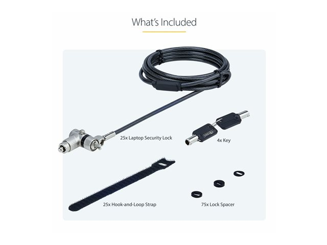 Produktbeskrivning StarTech.com 25-Pack Universal Laptop Lock 6.6ft, Keyed Alike Locking Cable, Security Cable, Compatible w/Noble Wedge/Nano/K-Slot, Anti-Theft Cut-Resistant Cable - TAA - lås för säkerhetskabel - TAA-kompatibel Produkttyp Lås för säkerhetskabel Förpackad kvantitet 25 (specificationerna gällerenskild post) Förpackningens innehåll 4 nycklar, snabbstartsguide, 25 säkerhetslås för laptops, 25 kardborreremmar, 75 låsbrickor Färg Svart, silver Produktmaterial Plast, stål Dimensioner (BxDxH) 4 cm 2 cm Längd 2 m Vikt 125 g Egenskaper Stöldskydd, Kensington Nano-uttag, Noble Wedge-uttag, Kensington standarduttag (K-uttag) TAA-kompatibel Ja Tillverkarens garanti 2 års garanti - Tillbehör