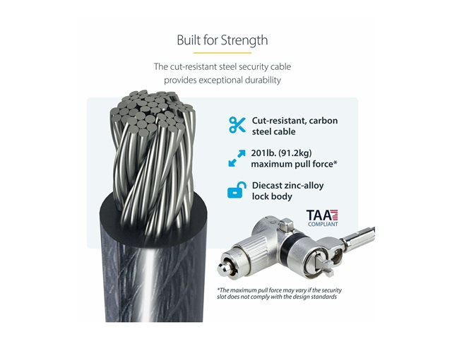Produktbeskrivning StarTech.com 25-Pack Universal Laptop Lock 6.6ft (2m), Master Keyed Locking Cable, Computer Security, Compatible w/Noble Wedge/Nano/K-Slot, Anti-Theft Cut-Resistant Cable - lås för säkerhetskabel - TAA-kompatibel Produkttyp Lås för säkerhetskabel Förpackad kvantitet 25 (specificationerna gällerenskild post) Förpackningens innehåll 25 säkerhetslås för laptops, 25 kardborreremmar, 75 låsbrickor, 50 nycklar Färg Svart & silver Produktmaterial Plast, stål Dimensioner (BxDxH) 1.4 cm 3.2 cm Längd 2 m Vikt 125 g Egenskaper Stöldskydd, Kensington Nano-uttag, Noble Wedge-uttag, Kensington standarduttag (K-uttag) TAA-kompatibel Ja Tillverkarens garanti 2 års garanti - Tillbehör