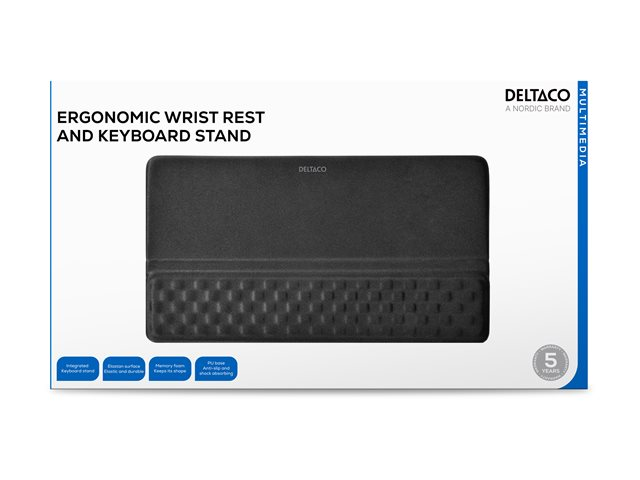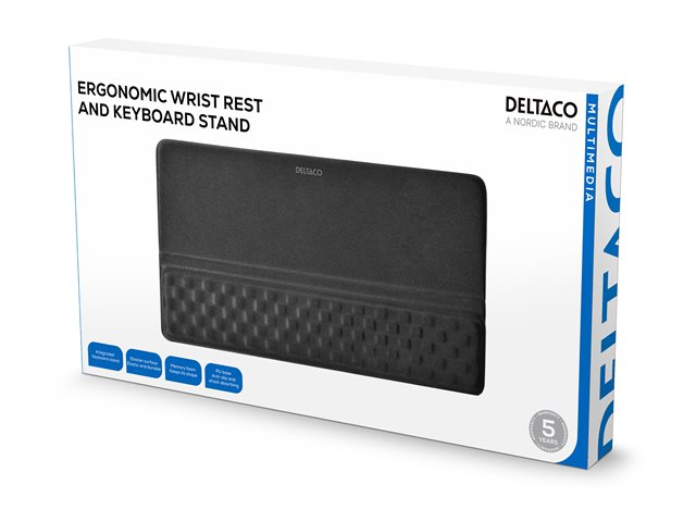 Produktbeskrivning DELTACO wrist pad with integrated keyboard stand - ergonomic Produkttyp Wrist pad with integrated keyboard stand Produktmaterial Lycra tyg, minnesskum, gel, polyuretan (PU) Dimensioner (BxDxH) 45 cm x 4.3 cm x 25.7 cm Vikt 880 g Färg Svart Tillverkarens garanti 5 års garanti - Nedladdningsbara filer