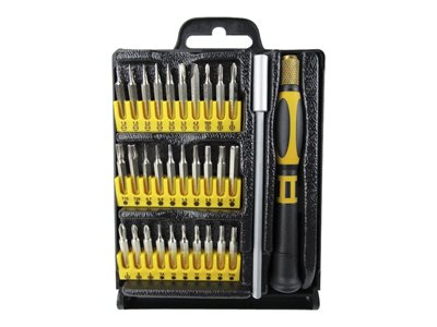 Produktbeskrivning DELTACOIMP VK-249 - skruvmejsel med bituppsättning - 32 delar Produkttyp Skruvmejsel med bituppsättning - 32 delar Förpackningsinnehåll Skruvmejselhandtag, 9 skruvmejselbitar - torx T4, T5, T6, T7, T8, T9, T10, T15, T20, 2 skruvmejselbits - pozidriv PZ0, PZ1, 8 skruvmejselbitar - hex 0,7; 0,9; 1,3; 1,5; 2; 2,5; 3; 4 mm, 4 skruvmejselbits - kryssskruvar PH000, PH00, PH0, PH1, 7 skruvmejselbitar - slot 1, 1.5, 2, 2.5, 3, 3.5, 4 mm, bitshållare - 115 mm Färg Svart, orange Hållare Fodral - plast - Nedladdningsbara filer
