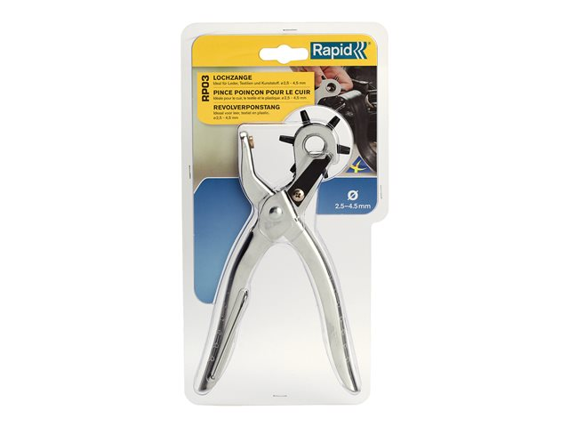Produktbeskrivning Rapid RP03 - tänger till hålslagare Produkttyp Tänger till hålslagare Skärkapacitet 2.5-4.5 mm diameter Lämpligt material Plast, leather, textile Produktmaterial Stål, aluminum - Nedladdningsbara filer