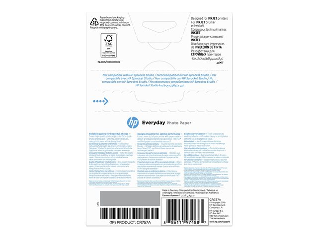Produktbeskrivning HP Everyday Photo Paper - fotopapper - blank - 100 ark - 100 x 150 mm - 200 g/m² Typ av produkt Fotopapper Ytbeläggning Blank Mediastorlek 100 x 150 mm Utskriftsteknik Bläckstråle Medievikt 200 g/m² Tjocklek på medier 8 mil Medföljande antal 100 ark Kompatibel med Deskjet 21XX, 2622, 36XX, Ink Advantage 21XX, Ink Advantage 36XX, Ink Advantage 38XX, Ink Advantage 55XX, Ink Advantage 5645, Ink Advantage Ultra 2529; ENVY 5010; Officejet 20X, 250, 38XX, 46XX, 52XX, 6000, 6000 E609, 6500 E709, 68XX, 7000 E809, 80XX; Photosmart B110, Wireless B110 - Nedladdningsbara filer
