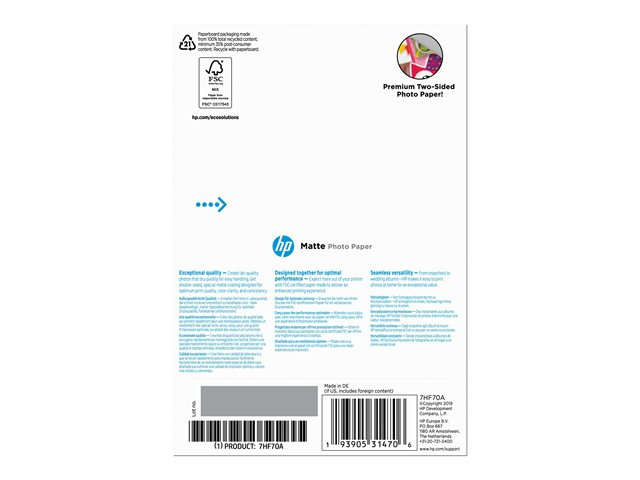 Produktbeskrivning HP - fotopapper - matt - 25 ark - 100 x 150 mm - 180 g/m² Typ av produkt Fotopapper Ytbeläggning Matt Mediastorlek 100 x 150 mm Utskriftsteknik Bläckstråle Medievikt 180 g/m² Tjocklek på medier 8,8 mil Medföljande antal 25 ark Tillverkarens garanti 1 års garanti Kompatibel med Deskjet 1000 J110, 10XX, 11XX, Ink Advantage 1015, Ink Advantage 1115, Ink Advantage 1275, Ultra Ink Advantage 2029; Officejet 100 L411, 150, 20X, 25X, 26XX, 38XX, 4500 G510, 45XX, 46XX, 52XX, 57XX, 6000, 6000 E609, 61XX, 6500 E709, 6500A E710, 68XX, 69XX, 7000 E809, 75XX, 76XX, 80XX, 8702, 9012 - Nedladdningsbara filer
