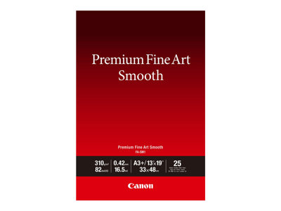 Produktbeskrivning Canon Premium Fine Art Smooth FA-SM1 - fotopapper - slät - 25 ark - A3 Plus - 310 g/m² Typ av produkt Fotopapper Ytbeläggning Slät Mediastorlek A3 Plus (330.2 x 482.6 mm) Utskriftsteknik Bläckstråle Medievikt 310 g/m² Tjocklek på medier 16,5 mil Ljusstyrka på medier 85 Medföljande antal 25 ark - Nedladdningsbara filer