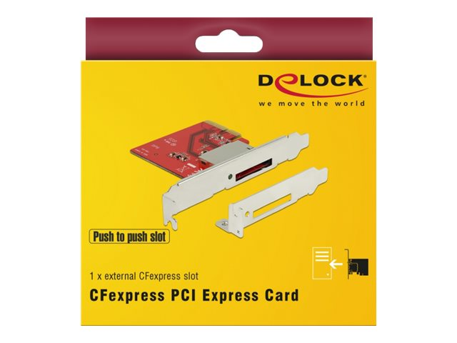 Produktbeskrivning Delock PCI Express > 1x external CFexpress slot - kortläsare - PCI Express x4 3.0 Produkttyp Kortläsare - intern Minneskort som stöds CompactFlash Card Värdgränssnitt PCI Express x4 3.0 Egenskaper LED-indikator - Nedladdningsbara filer