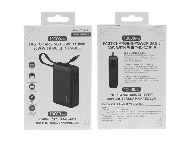 Produktbeskrivning Insmat power bank - 2 x USB-C, USB - 30 Watt Typ av produkt Power bank Dimensioner (BxDxH) 5.9 cm x 2.6 cm x 8.8 cm Typ av utkontakt Total 3: 2 x USB-C, USB Snabbladdningsteknik Power Delivery, Fast Charge Batteri 10000 mAh Effekt 30 Watt Strömenhetsinformation 2 x - USB-C - ingång/utgång - 20 V - 20 W - 1.5 A