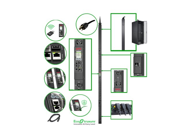 Produktbeskrivning APC Rack PDU 9000 Switched APDU9941 - kraftdistributionsenhet - 4992 VA Typ av enhet Kraftdistributionsenhet - kan monteras i rack Sladdlängd 3 m Stativstorlek 0U Vikt 8.5 kg Inspänning AC 200/208 V Utspänning AC 200/208 V Effektkapacitet 4992 VA Inmatningsanslutningar 1 x power NEMA L6-30P Utdatakontakter 21 x effekt IEC 60320 C13/C15