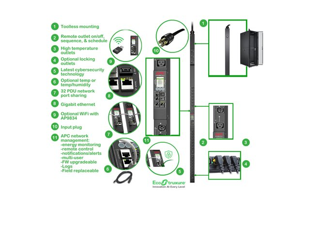 Produktbeskrivning APC Rack PDU 9000 Switched APDU9965 - kraftdistributionsenhet - 8.6 kW - 8600 VA Typ av enhet Kraftdistributionsenhet - kan monteras i rack Sladdlängd 1.82 m Stativstorlek 0U Vikt 8.18 kg Ingångskablage 3-fas Inspänning AC 208 V Effektkapacitet 8.6 kW / 8600 VA Inmatningsanslutningar 1 x ström NEMA L21-30P Utdatakontakter 21 x effekt IEC 60320 C13/C15