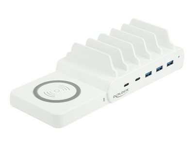 Produktbeskrivning Delock USB and Wireless Charger laddningsstation - + växelströmsadapter - 3 x USB typ A, 2 x USB-C - 110 Watt Typ av produkt Laddningsstation + växelströmsadapter Dimensioner (BxDxH) 9.5 cm x 23.6 cm x 5.6 cm Färg Vit Typ av utkontakt Total 5: 3 x USB typ A, 2 x USB-C Nätspänning AC 100-240 V (50 - 60 Hz) Tillförd spänning 5 / 9 / 12 / 15 / 16 / 20 V Max elektrisk ström 5 A Snabbladdningsteknik Power Delivery Trådlös laddning Ja Effekt 110 Watt Kablar Strömkabel - 1.5 m - Nedladdningsbara filer