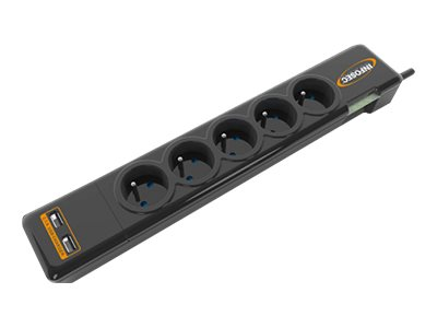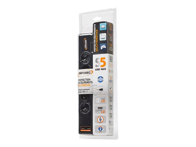 Produktbeskrivning INFOSEC S5 USB NEO - överspänningsskydd - 3680 Watt Typ av enhet Överspänningsskydd - extern Sladdlängd 1.5 m Vikt 520 g Lokalisering Frankrike Inspänning AC 230 V Effektkapacitet 3680 Watt Inmatningsanslutningar 1 x ström CEE 7/5 Utdatakontakter 1 x ström CEE 7/5 (spänningsutjämnare) - 230 V